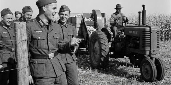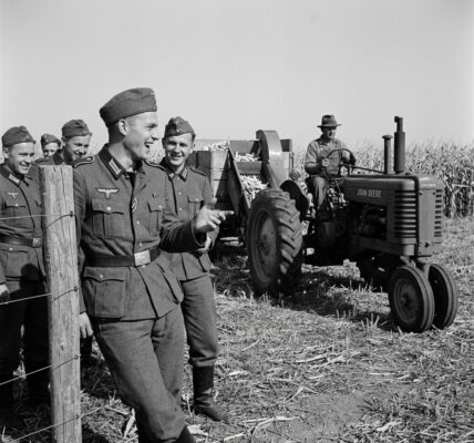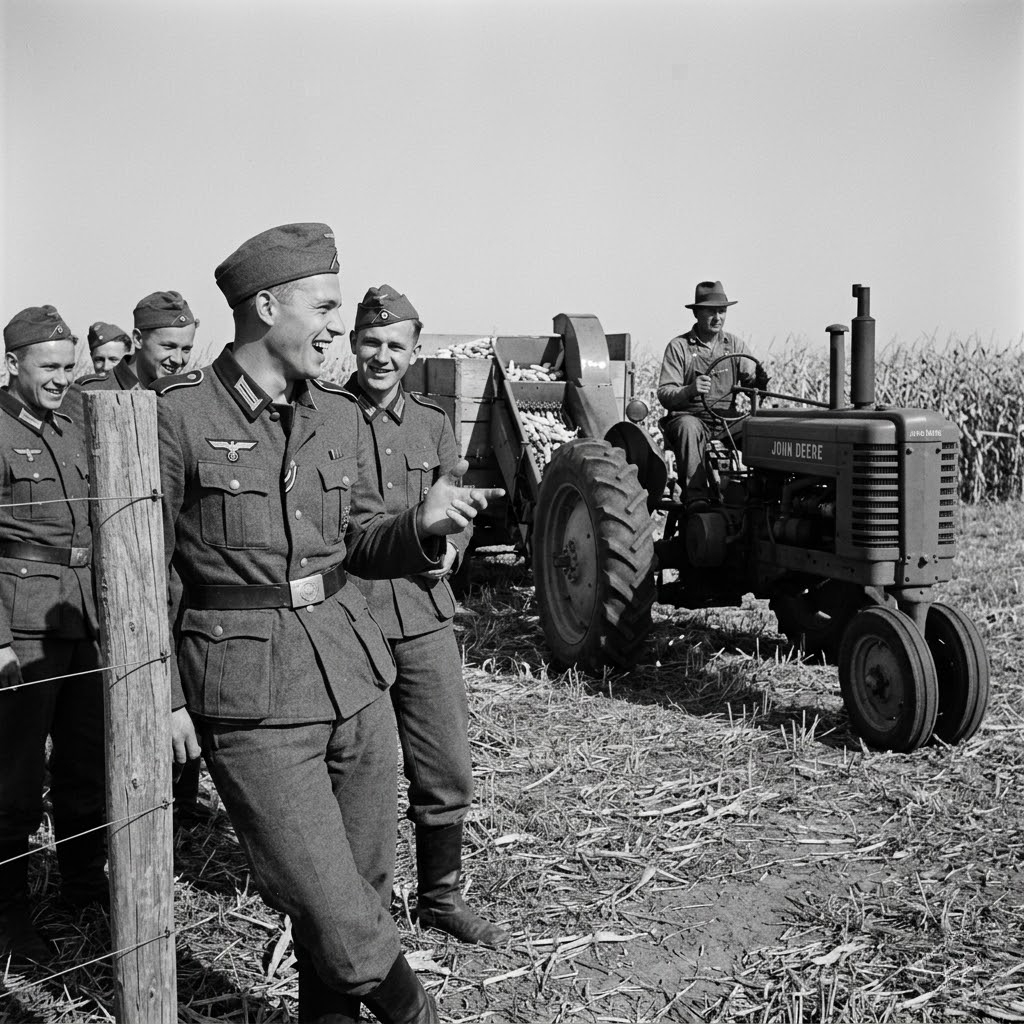 They stood at the fence line watching the American farmer drive past on his tractor. Slow, methodical, one man on a massive machine pulling equipment across endless fields. The German prisoners started laughing. Camp Concordia, Kansas, October 1943. 200 German…