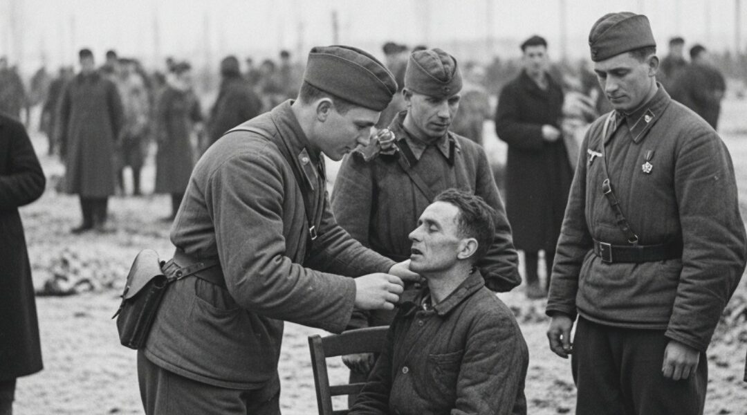 In una foto sopravvissuta, si china su un prigioniero: un uomo emaciato e indebolito, il cui volto sembrava un’ombra. Intorno a loro, altri soldati osservano in silenzio. La luce è fredda, diffusa. Impronte e neve calpestata sono visibili sul terreno.
